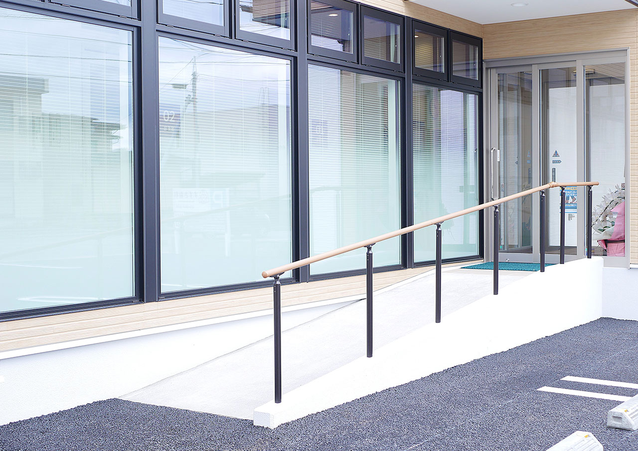 院内はバリアフリー設計です。ベビーカーや車いすをご利用の方にもスムーズに通っていただけるよう、入口にはスロープを設置しております。ご家族連れから介添えが必要な方まで、どなたにも通いやすい歯科医院をめざしています。